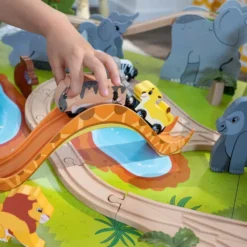 Every loop through the KidKraft Adventure Tracks Safari Run Play Table is a surprise! Come neck to neck with giraffes, slide down elephant backs, slither across a python bridge and swing underneath monkeys in trees. Magnets let you connect animal vehicles together to journey along as a pack. Explore and make friends in this vibrant land with creative wooden tracks. And, when your expedition is over, gather all pieces for a slumber suspended in the storage net underneath. Then, use the cleared-off tabletop for any other imaginative play. Have a wild time with each twist and turn in the Adventure Tracks Safari Run Play Table by KidKraft.