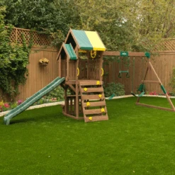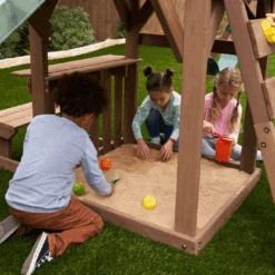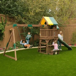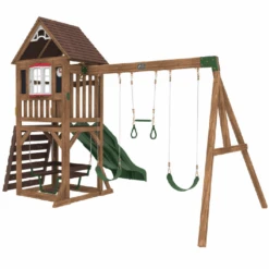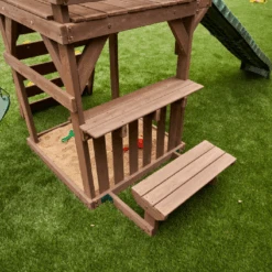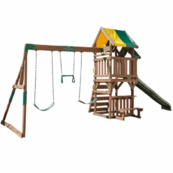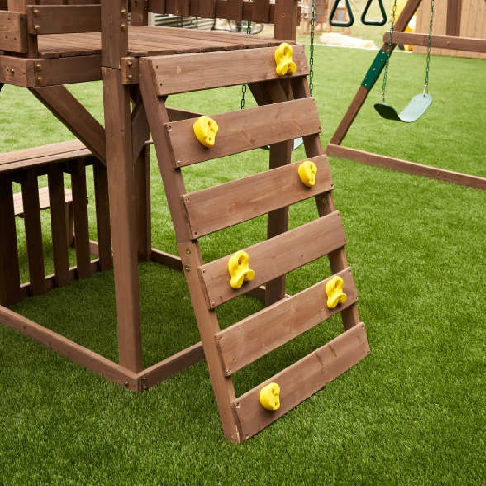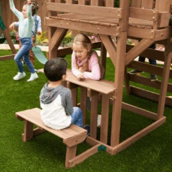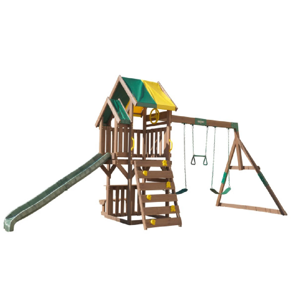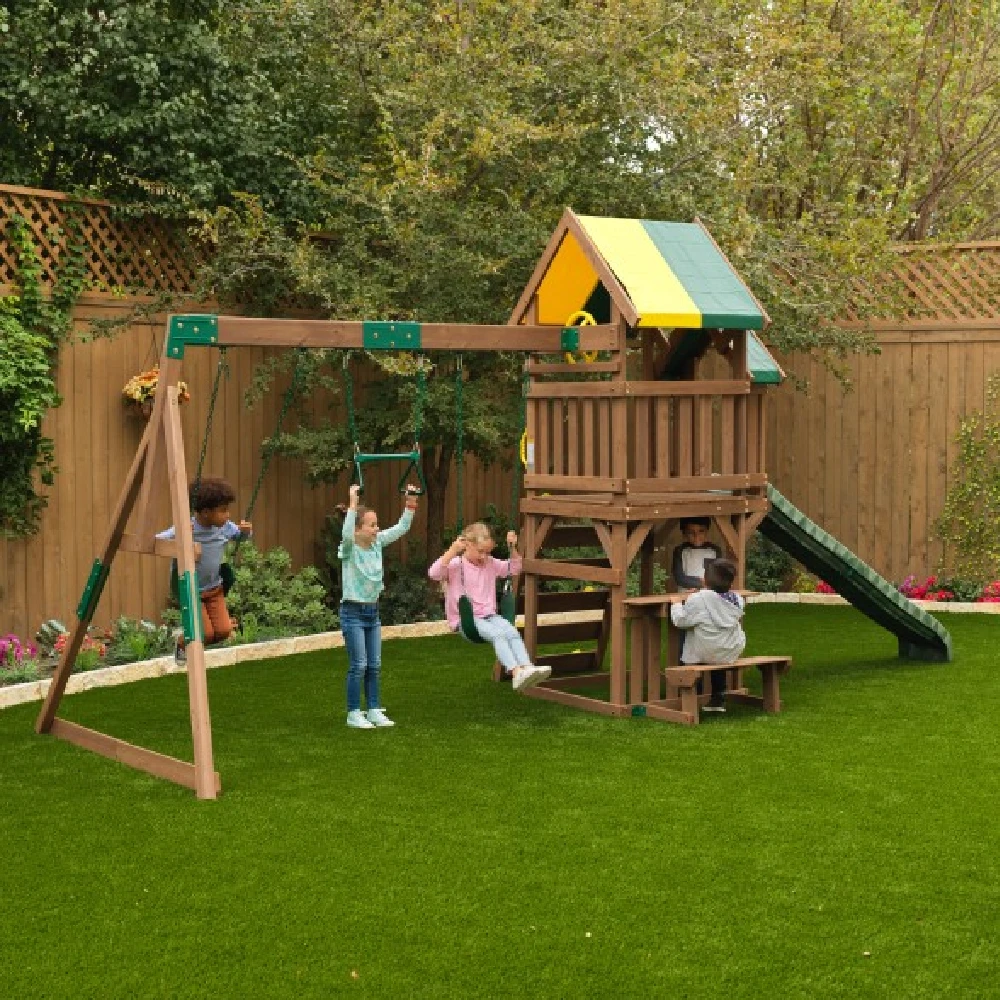 Up, down and all around, the KidKraft Arbor Crest Deluxe Playse blends into your backyard like it was meant to be there. Active young bodies and minds will be entertained and challenged with the numerous activities on this playset. Swings, rock wall ladder and slide get the excitement going. A bench and table is just right for having a snack, putting on a puppet show or pretending to serve play food.