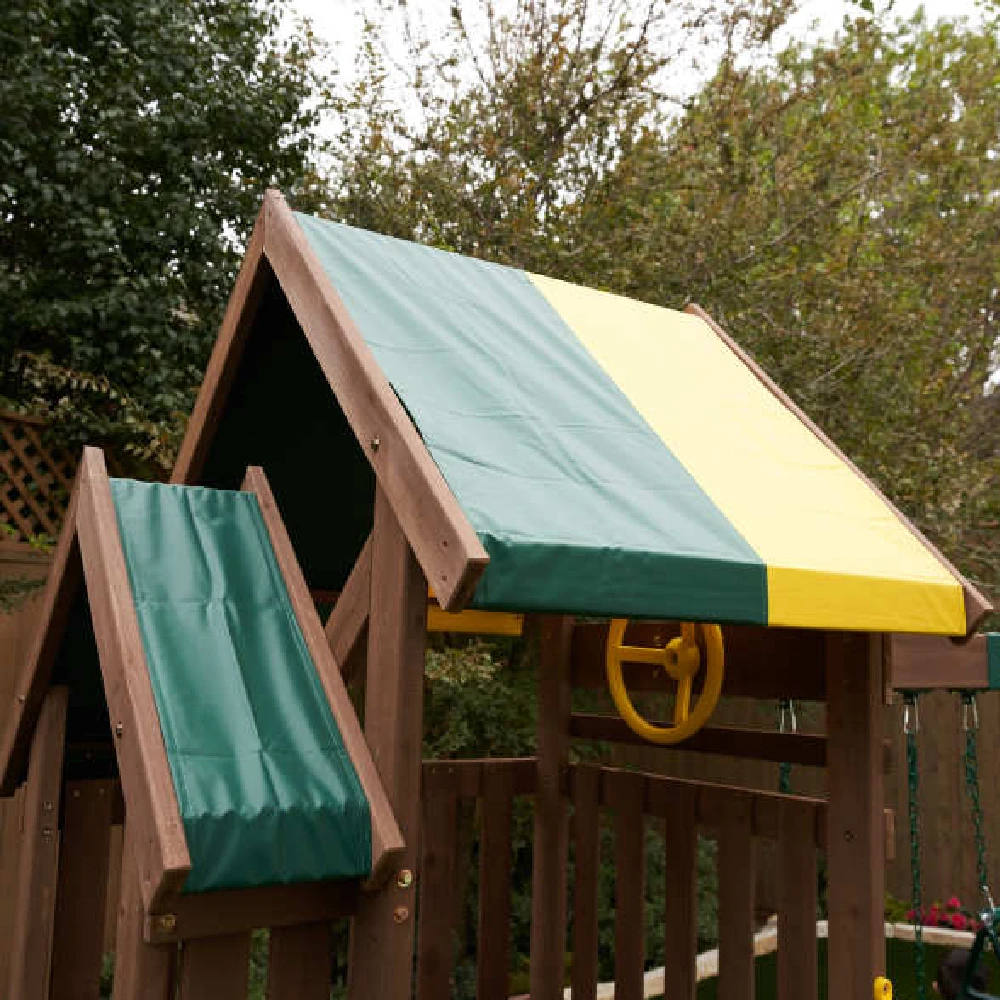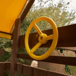 The large upper deck is shaded for sunny adventures. A steering wheel propels play to distant horizons. The fun will last all day out in the Arbor Crest playset by KidKraft.