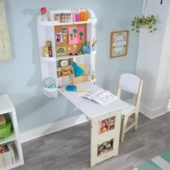 Space in a home is precious, especially in a kid’s room. But, with the KidKraft Arches Floating Wall Desk & Chair, you don’t have to give up floor space for a study area. The innovative, space-saving design features a shelving area attached to the wall with the desk surface folding down when needed. There are plenty of spots to store stuff—11 total—including bins on the sides, shelves, and even an angled slot for paper. A cork bulletin board sits in the center, ready to be the place to look for reminders, schedules, or just pretty artwork. Kids can sit in the included modern-styled wood chair and have ample workspace on the smooth desktop. And, with locks on the brace of the tabletop, you know it stays securely in place. Plug in a laptop, and thread the cords through the cutout so everything is neat, giving them a clear area to do homework or be creative. Fold up when not in use. Use the cutouts on the legs as picture frames to hold photos or artwork. The Arches Floating Wall Desk and chair is the perfect set to grow with your child as they progress from playtime to school time.