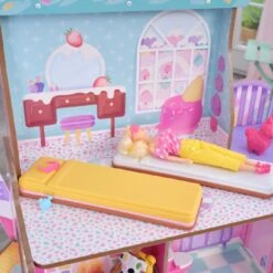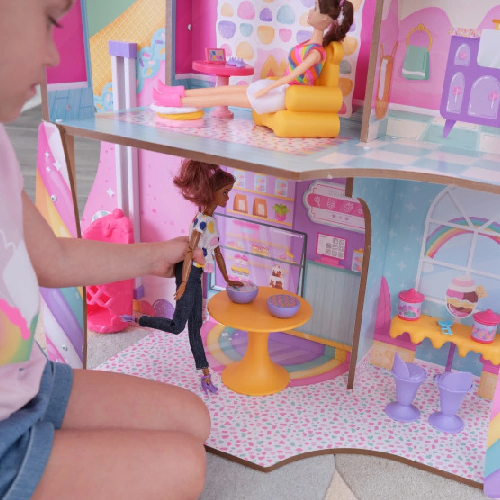 Super-sweet Kidkraft Candy Castle Dollhouse will have kids on a sugar rush of imagination. With a rainbow palette across three levels and seven play areas, this magical almost 4-foot tall wooden doll house is ready to treat dolls to a fun-filled day. Hang out with the lovable cotton candy llamacorn in the lower-level sweet shop. Pick out your favorite goodie and enjoy while sitting on the ice cream cone stools at the mesmerizing dripping counter. Even the elevator is a twist on the traditional—it’s an ice cream sundae where dolls sit and ride up a floor.