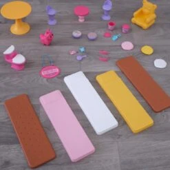 - 28 total furniture and play pieces, including exclusive cotton candy llamacorn figure, gummi bear chair, ice cream cone stools and sleep masks