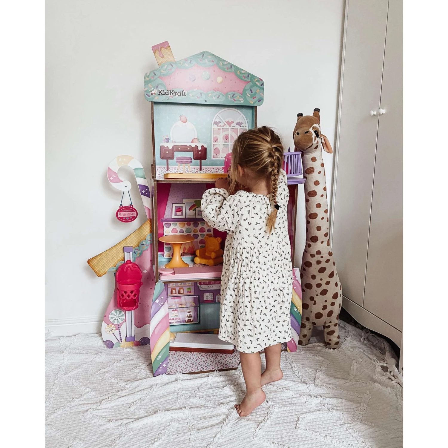 Super-sweet Candy Castle Dollhouse by KidKraft will have kids on a sugar rush of imagination. With a rainbow palette across three levels and seven play areas, this magical almost 4-foot tall wooden doll house is ready to treat dolls to a fun-filled day. Hang out with the lovable cotton candy llamacorn in the lower-level sweet shop. Pick out your favorite goodie and enjoy while sitting on the ice cream cone stools at the mesmerizing dripping counter. Even the elevator is a twist on the traditional—it’s an ice cream sundae where dolls sit and ride up a floor. The second floor boasts a gumdrop fireplace with a gummi bear chair. Next door is the mint-condition bathroom. Upstairs is where you can have extra-sweet dreams while lying on a five-layer ice cream sandwich bed. Beds can be separated to accommodate guests for a sleepover. A trio of Neapolitan ice cream colored pillows provides a soft touch. Finally, gaze out over your candy wonderland from the extended balcony. Every moment spent in the KidKraft Candy Castle Dollhouse is sure to be treat.