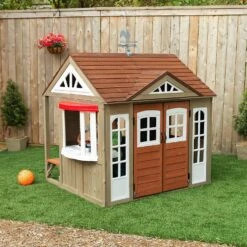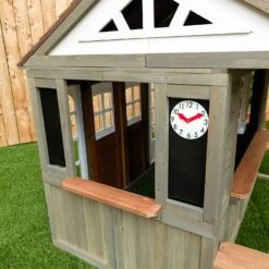More open spaces allow for a bigger imagination. That’s the philosophy behind the KidKraft Country Vista Playhouse that features unique double doors that welcome kids into a wide space to explore pretend living in a farmhouse-inspired area. Kids and parents alike will love the quaint exterior features — generously sized rounded windows, warm gray-toned wood and a timeless weathervane. Accents of white and red add to the refreshing, barn-like atmosphere. The open window with ledge is a cute spot for children to pretend they’re little entrepreneurs of a fruit and vegetable stand or snack shop. They can write out today’s fresh crops or specials on the chalkboard and use the moveable-hands clock to set their opening hours. The shaded space on the side with dual benches is the perfect spot for guests to relax with their treats. Inside, children will adore the kitchen sink and burners that enhance their pretend cooking. With the broad entryway, kids can bring in their own furniture to personalize their house. Even a bicycle could fit in the space! Thanks to our exclusive EZ Kraft Assemblyâ„¢, installation is mostly a matter of unpacking and unfolding. Their country retreat is merely a dream away! Bring the simple fun and peace of farm living to your own backyard with the KidKraft Country Visa Playhouse.