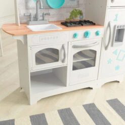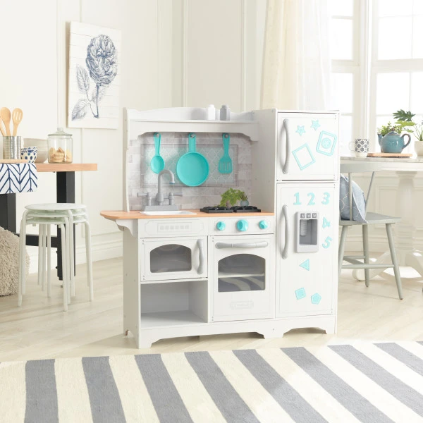 Kitchen play just got a whole lot tastier because of the exciting and trendy KidKraft Countryside Play Kitchen. Whip up fun for little chefs with this countryside-inspired play kitchen that’s packed with exceptional details and delicious features, including a magnetic refrigerator with top freezer so kids can decorate with magnets or put up shopping lists. Nothing is cooler than the working ice maker that dispenses plastic ice cubes! When kids are ready to fire up the gas stove or the oven, they’ll be delighted to find that the knobs make a fun clicking sound when turned. As culinary creations are in the oven or microwave, kids can proudly show mom and dad what they’re making through the showcase doors! With a 6-piece accessory set, a spacious sink and an adorable farmhouse design, the KidKraft Countryside Play Kitchen is the perfect addition to your little chef’s bedroom or playroom!