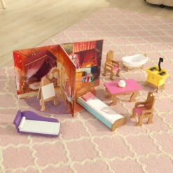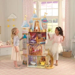 The Disney Princess Royal Celebration Dollhouse by KidKraft is a four-level magical castle inspired by your favorite Disney Princess stories. It stands over five feet tall, features a 9-piece furniture set and a bonus expansion accessory storybook that provides even more play rooms when opened. The graphics are delightful nods to well-known Disney Princess tales. See how many characters you can find throughout the fanciful dollhouse. With a working turret elevator, grand winding staircase and elegant rooftop balcony, the play flows easily from room to room for fun re-enactment of favorite Disney Princess tales. An accessory pack includes 9 pieces of royal furniture including an innovative sticky-pad easel for impromptu art paintings. This wooden dollhouse with golden touches throughout is an enchanting addition to any little playroom or bedroom and will be a treasured item for years to come!