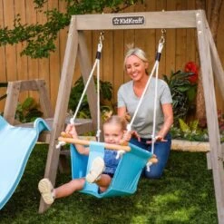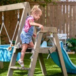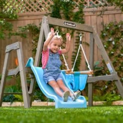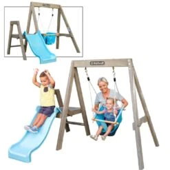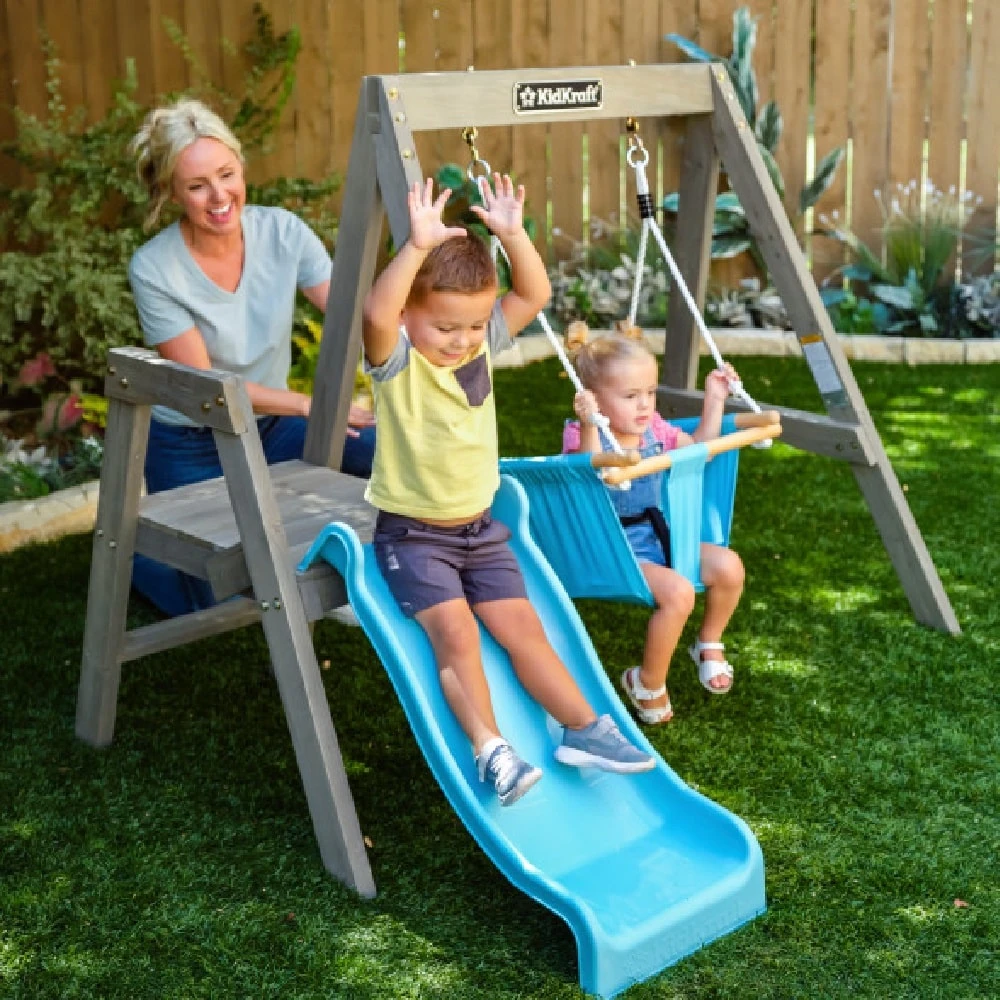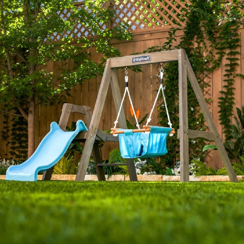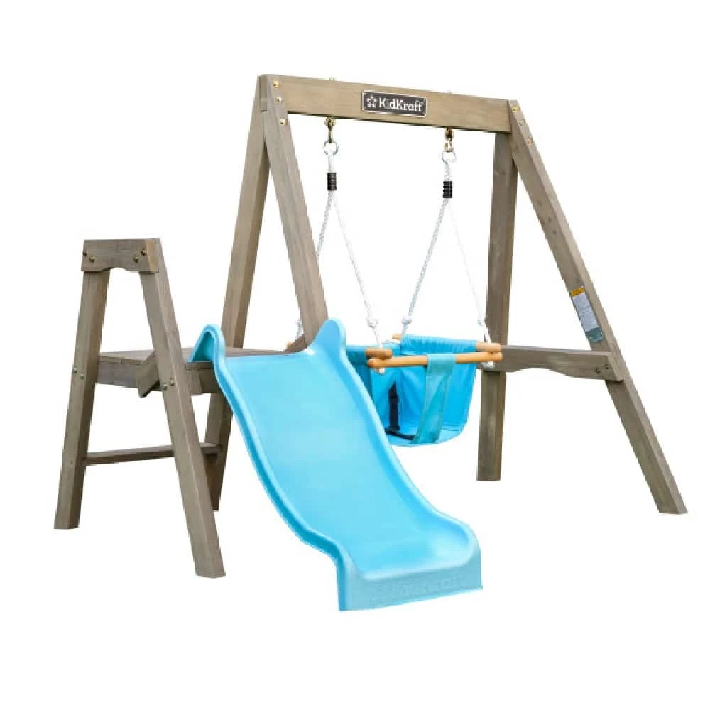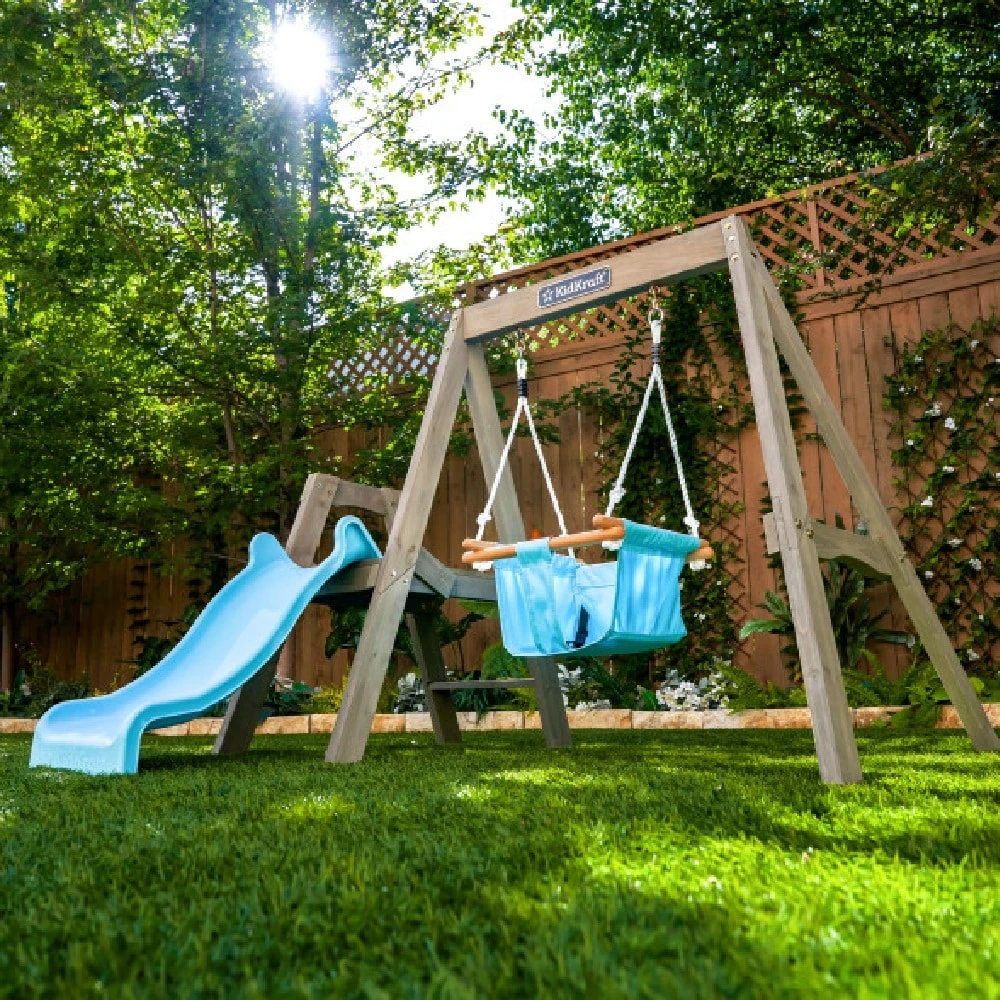 When your child is not quite ready for our big swing sets, this beginner version, Kidkraft First Play Wooden Swing Set, will help them learn how to swing and slide with ease. Build up their confidence with the one-rung ladder that gets them to the top of the slide. The wave slide has a gently sloped edge for soft landings. Introduce toddlers to the joy of soaring through the air in a bucket swing just their size.