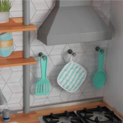 - 3-piece accessory set includes spoon, spatula and pot holder hanging on pegs above stove