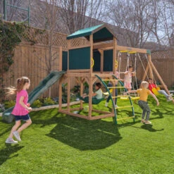 The KidKraft Hideaway Haven Swing Set is the perfect setup in the backyard to get out some wiggles and let loose some giggles. With the must-have belt swings and wavy slide, this outdoor wooden playset is already providing tons of active play. But notice the newly added surf swing and arched ladder for some extra-fun challenges. Kids can pretend they’re skimming the waves or the ski slopes on the stand-up surf swing with soft-touch rope. And scaling the curved rungs of the ladder makes the ascent into the cozy chalet even more exhilarating. The upper deck is covered by a canvas roof and walls that make it a great clubhouse atmosphere that provides both independence for kids and security for parents. The included shelf could be used as a small writing area, a place to store toys or a small workbench. Below is another hangout spot—a super-cool hammock. Secured on all four sides, it gives kids a place to rest their bodies while still activating their imaginations. It’s a great area to read a book, listen to music, or pretend you’re on a raft floating down a river. Whichever activity you choose on the Hideaway Haven, you’ll always encounter adventure.