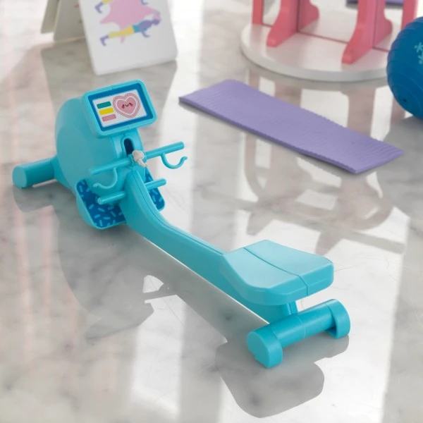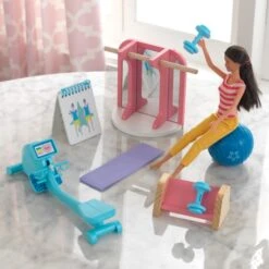 Even dolls need to exercise and stay healthy with the KidKraft Home Gym Dollhouse Accessory.  Add-on set includes a variety of workout equipment to outfit any home gym. Barre class? Stretch on the barre with mirror. Pilates? Try out the inflatable workout ball. Heavy lifting? Weights and rack let dolls tone away. This item is an ideal way to freshen up any dollhouse.