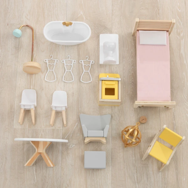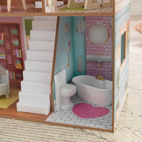Our KidKraft Juliette dollhouse is a modern refresh of a traditional-sized dollhouse. The stylish furniture is contemporary and simply streamlined in calming colors. The oven door and the toilet lid open and close for interactive play. Standing over four feet tall and featuring three levels of play, this house offers hours of endless fun for curious kids. Tons of detail have gone into the graphic backgrounds throughout this house, spurring their imaginations. A whole entourage of 12″ / 30 cm dolls can relax comfortably on cushioned furniture, thanks to the molded fabric. Or, they can enjoy the quaint outdoor patio.