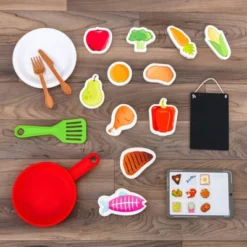 - Complete with 18 play pieces including food, pot, spatula and chalkboard