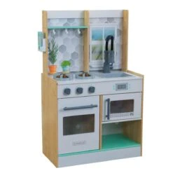The KidKraft Let’s Cook Natural Play Kitchen is positively packed with interactive features. Clicking, turning oven knobs, opening appliance doors, a pull-down faucet and realistic burners with lights and sound provide hours of fun for aspiring chefs. Shelving and hooks provide plenty of storage for play food, flatware or anything little chefs need to create imaginative meals for their family. A play phone clips to the side of the cabinet for hands-free fun. Made to love and built to last, the KidKraft Let’s Cook Play Kitchen is designed to spark imaginative fun in the playroom for years to come.