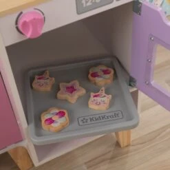 Emojin’ the fun in the expressive KidKraft Lil’ Friends Play Kitchen that’s full of personality! With its own line of accessories, these new kitchen buddies will be fully equipped for cooking duty. Cheerfully decorated, this pastel-hued baking center is ready to whip up creativity. All doors feature cutout notches for opening and closing with ease. Magical graphic prints pop up on the bin, mitt and even the cookies! With so much to discover there will be stories, smiles and sweet surprises all day in the Lil’ Friends Play Kitchen.