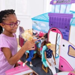 Upon entering the plane, find your seat and stow all luggage in the overhead compartment. Then sit back, relax with your rainbow neck pillow and let the captain in the cockpit soar through the skies. When the seatbelt sign is off, feel free to roam to the lavatory if needed. When you land, don’t forget to pick up your luggage from the spinning baggage carousel. Then, check the board for your next connection! Bon voyage! Check out other travel with KidKraft’s Luxe Life 2-in-1 Cruise Ship & Island play set too!