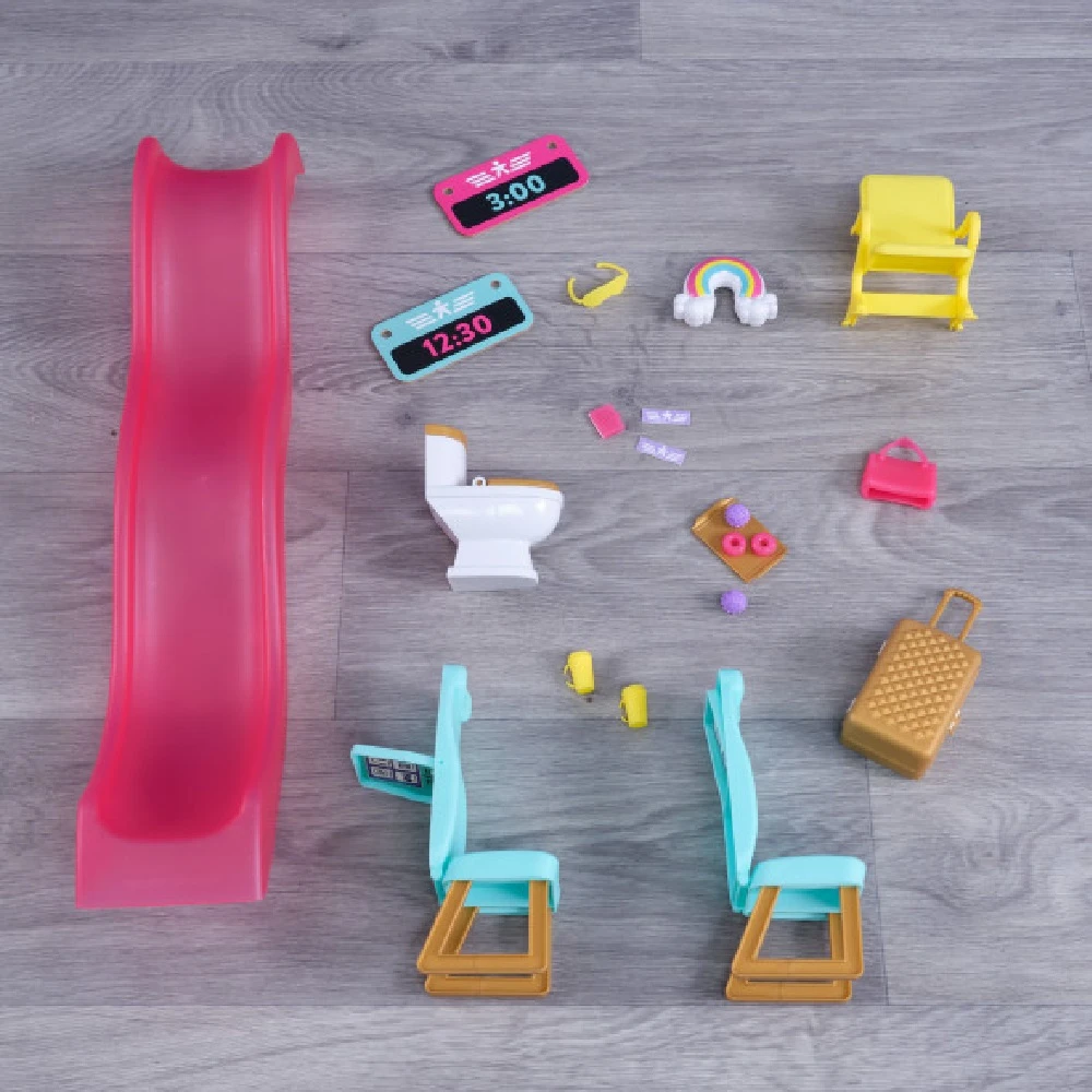- 15+ play pieces including fun travel accessories like a rainbow neck pillow, suitcase and passport