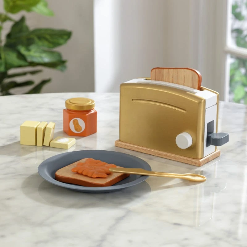 The KidKraft Modern Metallics Toaster Set` is now updated in a shiny metallic color for an extra-glam breakfast! The set comes with bread, a butter knife, jelly and a stick of butter that kids can really slice.