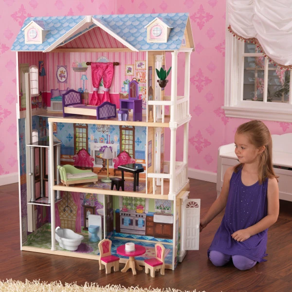 Playing house has never been so fun. With the four-foot KidKraft My Dreamy Dollhouse, kids have four rooms to decorate, with a gliding elevator that spans all three floors. Two balconies and a working front door offer plenty of room to explore and enjoy. The included 14-piece accessory kit includes a grand piano that plays music and a toilet with flushing sounds. This dollhouse is a dream come true for 12-inch dolls.