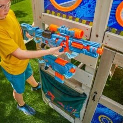 Combine a playset with Nerf features and you get the KidKraft Nerf Command Base Battle Fort—the ultimate site for epic blaster battles. Storm across bridges, ladders and gangplanks to gain the best vantage point. Exit quickly through the escape trap door. Stockpile blasters and darts in the battle prep area or pulley crate. Plan missions and practice your aim to become a battle expert. Test your skills with a spinning target. Be in control of the backyard with this action-packed multi-tower. Nerf blasters and darts not included.