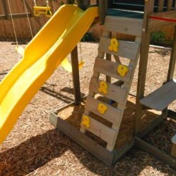 Situated underneath the deck, the open area can transform into a sandbox to provide a shaded space to dig up more adventures. Parents will be delighted as they watch their happy kids play on the recyclable, wood playset with child-friendly, water-based stain, designed for long-lasting play in the backyard.