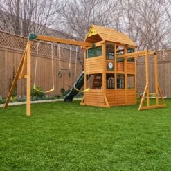 The sky’s the limit when it comes to play zones in the Overland Heights Swing Set from KidKraft. Soar through active and imaginative play on this expansive wooden backyard playset. There are plenty of spots for multiple kids to play and make believe. A trio of swings is ready for high-flying trapeze adventures. A duo of slides lets kids imagine they’re sledding down a mountain. Side-to-side slides make it fun to race each other as well. Wooden monkey bars become the daring way over a waterfall. With two clubhouse levels, there’s ample room to have a little bit of downtime too. Use the top portion as a hangout with all your buddies. The windows on the upper level even have mesh coverings to help block out the sun and keep it cooler. Cook up a backyard feast on the cooktop and serve to your guests at the window ledge and bench area. Play a quick game of tic-tac-toe on the chalkboard while you wait. Climb the rock wall ladder to the upper level to survey the landscape and plan your next journey. With the Overland Heights as your base, it’ll be epic. Set is crafted of premium, recyclable materials with child-friendly, water-based stain for long-lasting play.