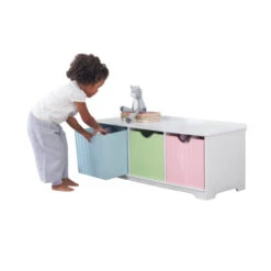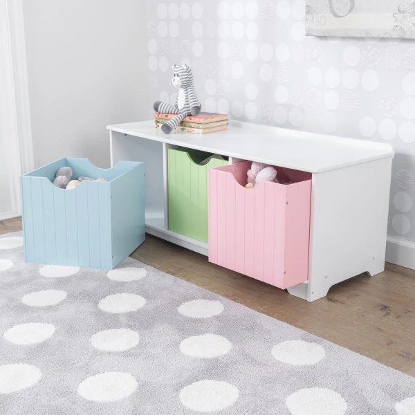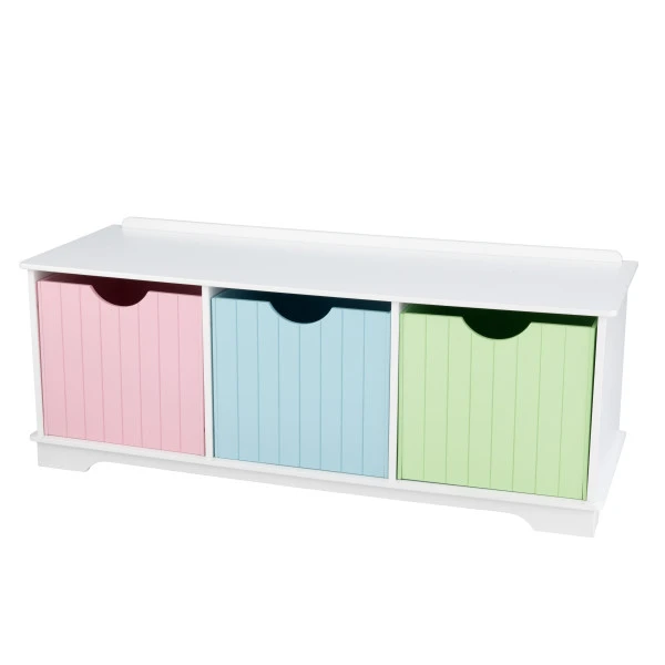 The Kidkraft Pastel Nantucket Storage Bench offers seating and storage in one attractive bench. Three removable storage bins feature classic wainscoting-style front panels.