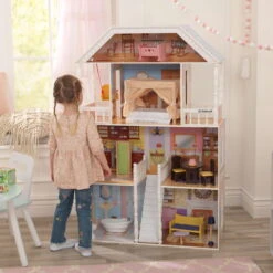 A classic dollhouse with southern flair, the KidKraft Savannah Dollhouse stands over four feet tall and features four levels of imaginative fun with six rooms and two balconies. A center staircase welcomes dolls into the home. There are cozy décor touches throughout. Notice the tiered pink cake—a sign of a perfect hostess. The included 14-piece accessory pack features exquisitely detailed, hand-painted furniture to fit 12-inch fashion dolls.