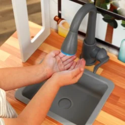 Meal plan just like mom and dad with the KidKraft Surprise Box Play Kitchen. Personalize the pre-packaged box of pretend food with cute messages, then place in the built-in mailbox and lift the flag to let them know their box has arrived. Kids will love opening up their newly delivered surprise of play food and accessories, then assembling everything to get cooking and even decorating for special occasions. Boxes store conveniently in slots underneath the oven when not in use. With a lights and sounds faucet, working ice maker and click-and-turn knobs, the action is realistic and non-stop fun.