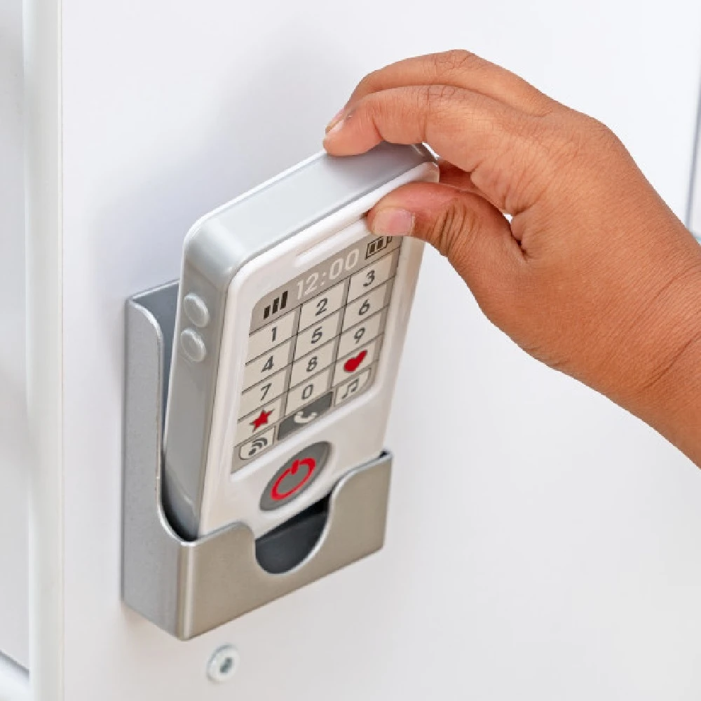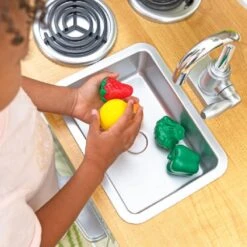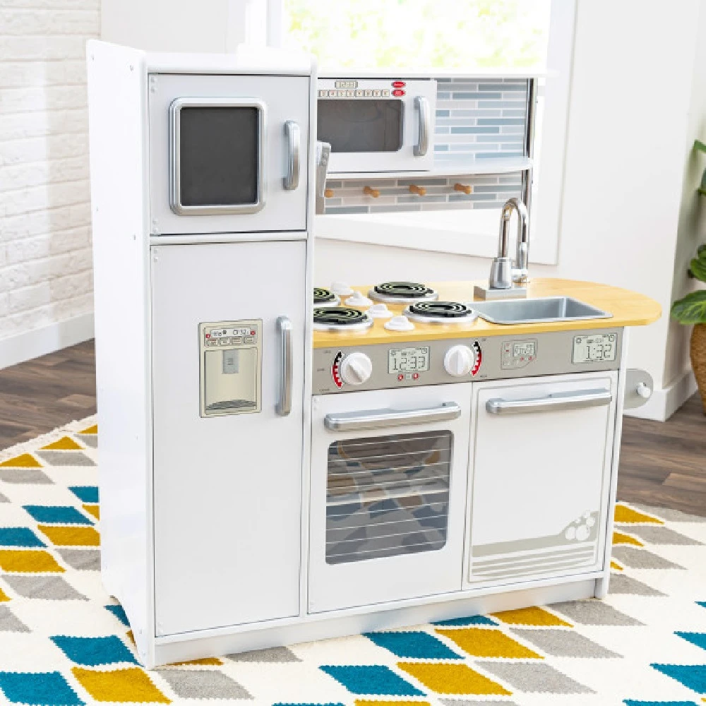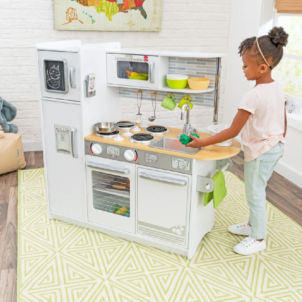 Time to cook up a little fun! Our KidKraft Uptown White Play Kitchen has a hip, modern look that young chefs are sure to love. With tile-look backsplash and sleek countertops, the design is emulated from trendy real-life kitchens. Every appliance is interactive, including doors that open and close, knobs that turn and click and a working chalkboard on the freezer door. Kids will love taking calls on the cordless play phone that attaches to the side of the refrigerator. Keep all accessories neat and handy with the pegs for hanging utensils and the side towel rack. Crafted from composite wood, the Uptown Espresso contemporary kitchen is a sturdy and stylish addition to playtime.