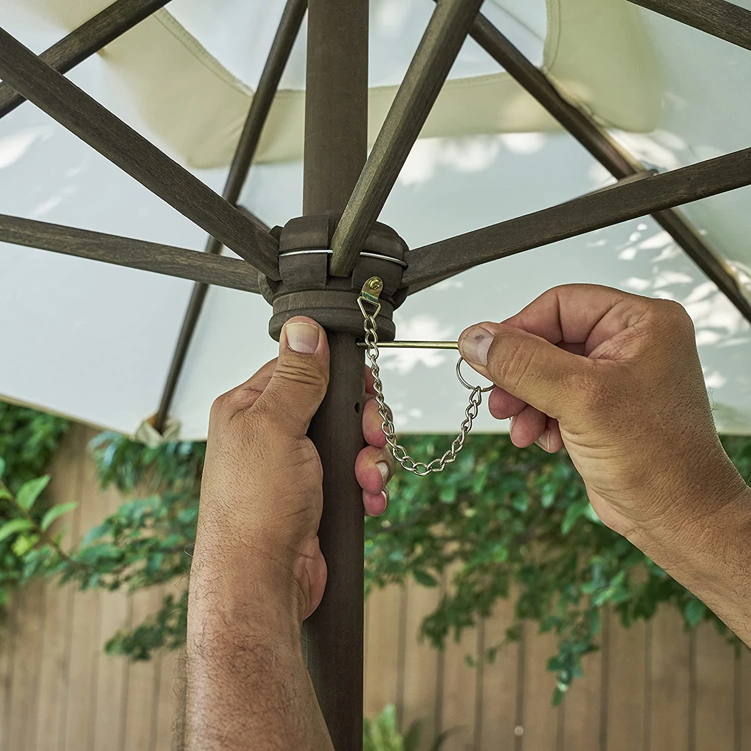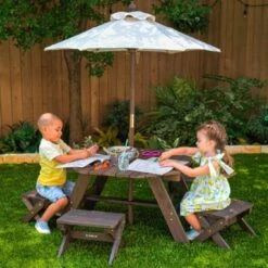 KidKraft Wooden Outdoor Sectional Ottoman & Umbrella Set with Cushions, Patio Furniture for Kids or Pets, Bear Brown & Beige
